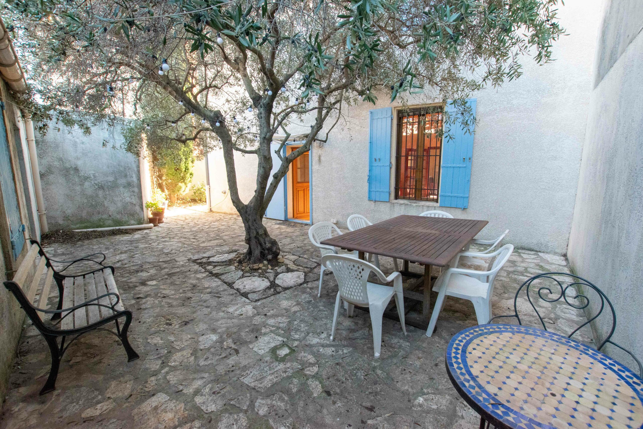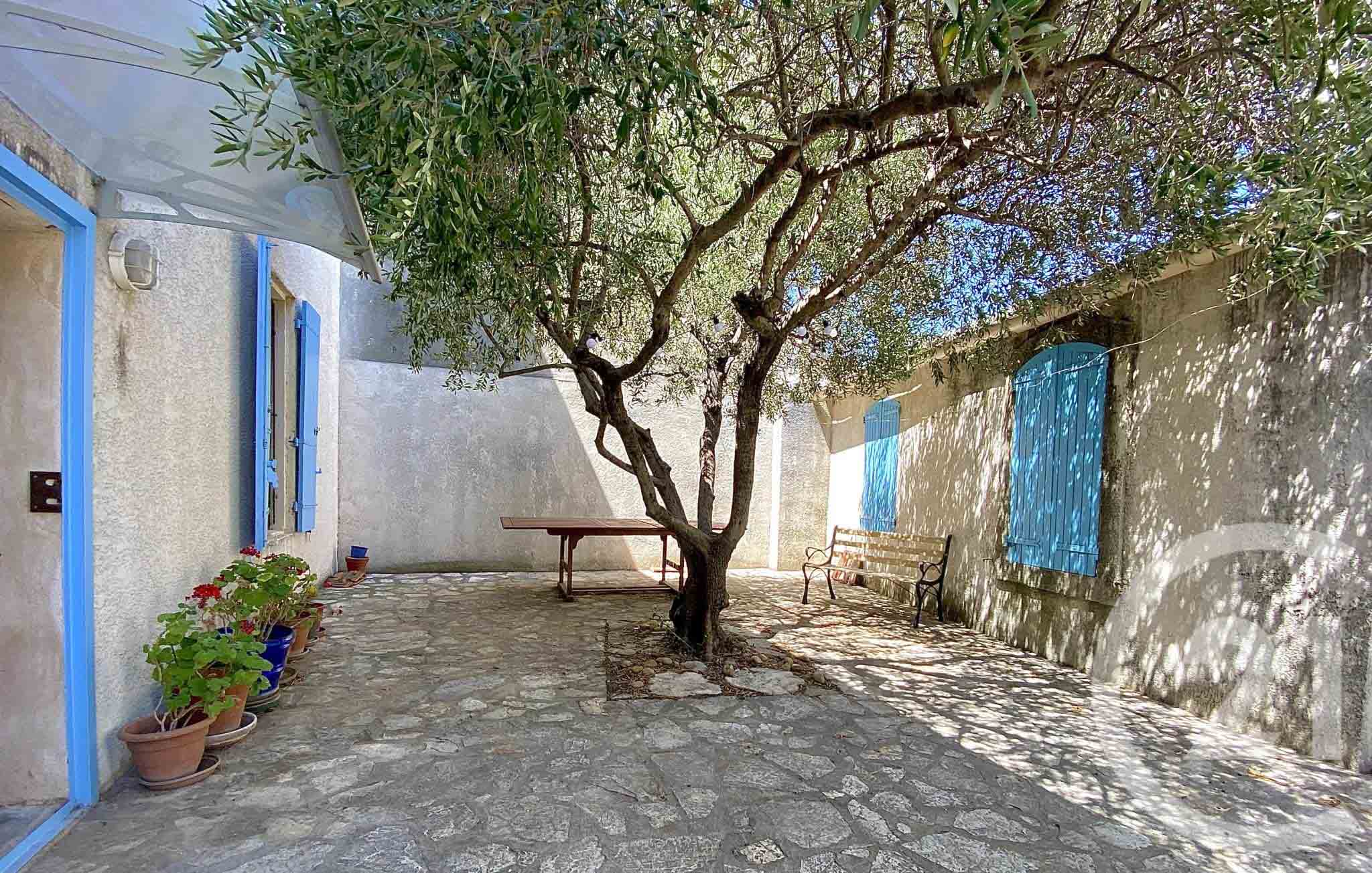 La maison dispose d’une cour ensoleillée avec tonnelle au sud, et d’une grande cour ombragée par un magnifique olivier au nord, idéal pour les chaudes journées d’été.